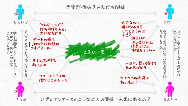 面白おかしいかどうかは知りませんが、ちょうどAbyssの雪国の人達が五人だったなーと思い出したので、サフィールを中心とした人間関係をチェックしてみました。