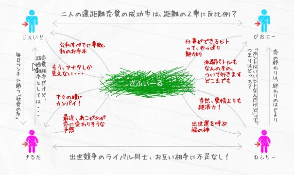 お堅いはずの郵便年賀のサイトに、何故か「きまぐれ人間関係相関図」なる頭のおかしいスクリプトがあります。曰く、「自分と年賀状を贈りたい相手の名前を書き込むだけで、自分を取り巻く人間関係の面白おかしい架空の相関図が、あらわれます」。余所のサイトさんで遊んでるのを見かけたことがあるので、そこそこ有名なのでしょうか?(こんな時期外れに言及してる奴は私だけでしょうけど)