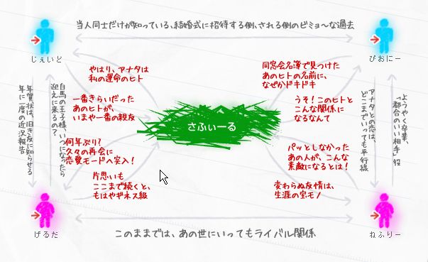 妙にドロドロしています。ちゃんと男女を選択する欄があるにも関わらず、やたらホモ関係を量産するのがこのスクリプトの謎。ジェイド→サフィール「もう、アナタしか見えない…」が熱烈すぎて怖いっス。